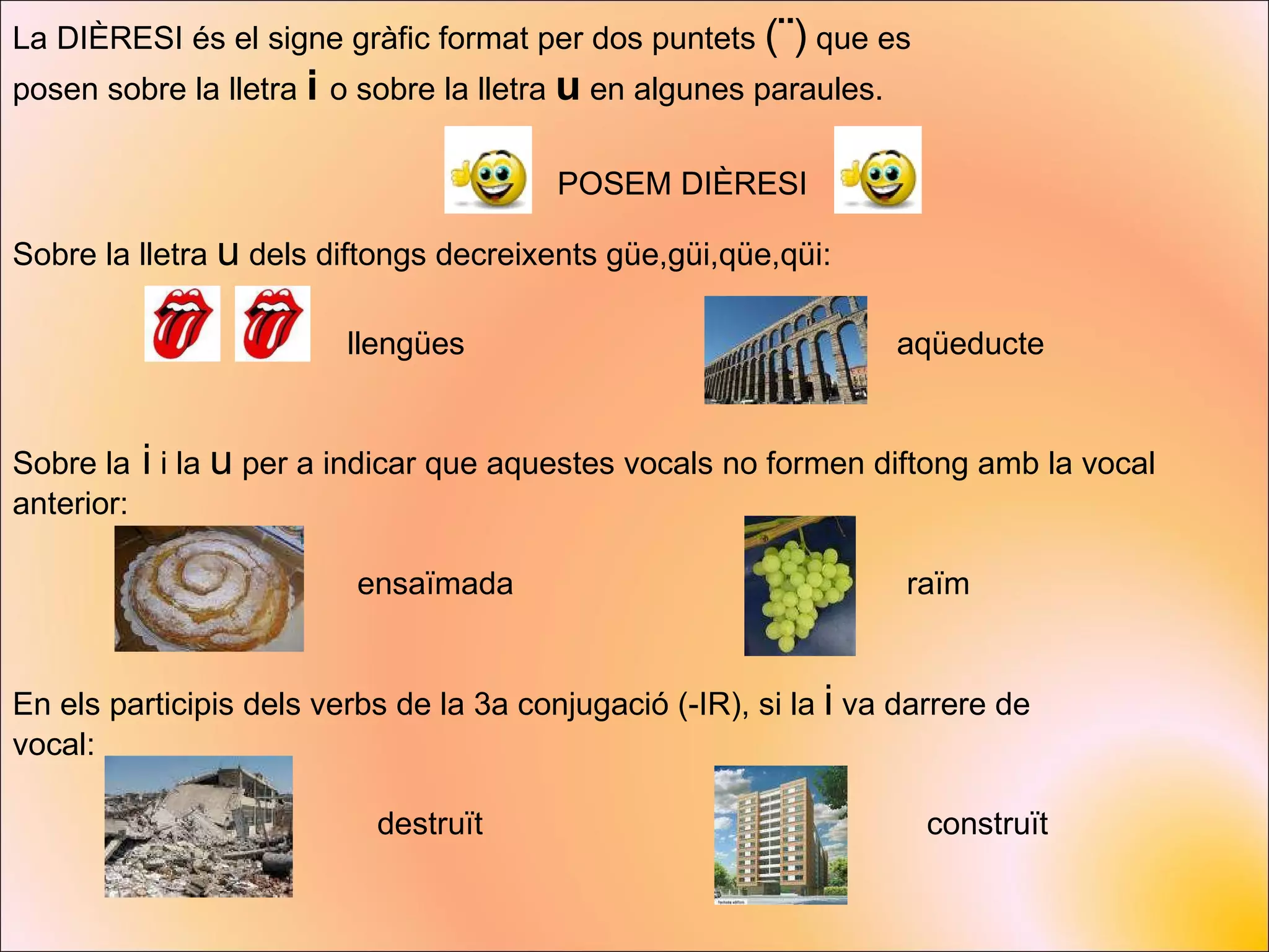 La DIÈRESI ésel signe gràfic format per dos puntets ( ¨ ) que es posen sobre la lletra i o sobre la lletra u en algunes paraules. POSEM DIÈRESI Sobre la lletra u dels diftongs decreixents güe,güi,qüe,qüi: llengües aqüeducte Sobre la i i la u per a indicar que aquestes vocals no formen diftong amb la vocal anterior: ensaïmada raïm En els participis dels verbs de la 3a conjugació (-IR), si la i va darrere de vocal: destruït construït