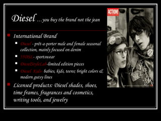 Diesel is an international brand known for denim and casual wear. It offers several apparel lines under the Diesel brand name and licenses its brand for accessories. Diesel was founded in 1978 and is headquartered in Italy. It has over 5,500 points of sale worldwide and 300 mono-brand stores across five continents. Diesel targets stylish men and women ages 20-35 who are independent and not influenced by fashion trends. The brand is known for quality fabrics and attention to detail in its made-in-Italy clothing.