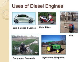 The document discusses diesel engines and how they work. It explains that diesel engines ignite fuel through heat of compressed air rather than a spark plug. It provides details on the 4-stroke diesel engine cycle including intake, compression, power, and exhaust strokes. It also describes the simpler 2-stroke engine cycle and discusses advantages and disadvantages of each.