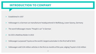 Volkswagen was found to have cheated emissions tests by installing software on 11 million diesel vehicles worldwide that could detect when they were being tested and reduce emissions output, violating environmental standards. The scandal could cost the company $18 billion in fines in the US alone and led to a 30% drop in its stock price. In response, VW's CEO resigned and the company set aside $7.3 billion to fix affected vehicles and launched initiatives to compensate customers and retain brand loyalty. To prevent future crises, experts say VW should move to a more open structure with transparent governance.