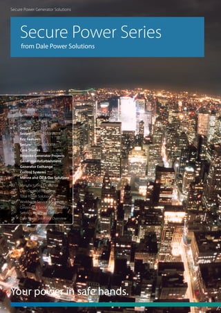 The Secure Power Series by Dale Power Solutions offers a comprehensive range of diesel generators from 7.5kVA to 3,300kVA, designed for various applications such as healthcare, telecommunications, and emergency services. Highlighting features like user-friendly controls, exceptional noise protection, modern control systems, and high ambient cooling options, these generators ensure efficiency, reliability, and environmental compliance. Supported by global warranty and service, the Secure Power Series sets a benchmark for generator solutions that meet diverse power requirements.