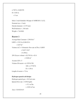 This document provides detailed specifications and calculations for the design of two reactors and associated equipment, including hydrogen quench coils, mechanical designs, nozzles, and heat exchangers. It covers reactor dimensions, design pressures, materials, and thermal properties, along with a fractionator's specifications, performing mass and energy balance calculations. The document encompasses critical calculations for heat load transfer, fluid velocities, pressure drops, and specifications of various components used in the reactor design process.