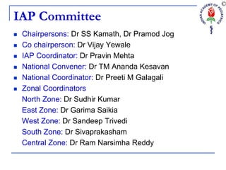 This document outlines the President's Action Plan for 2015 by the Indian Academy of Pediatrics (IAP). It discusses establishing the D.I.E.T. program to promote healthy diets, interaction, exercise, and limiting TV/media time for parents and teachers. The committee members organizing the program are named. The document then covers various topics related to diet, including issues like anemia, junk food, skipping meals, and promoting healthy options like homegrown foods and breastfeeding. It emphasizes establishing good eating habits in children for physical and mental well-being.