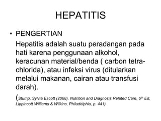 Dokumen ini membahas diet pada penyakit hati, termasuk berbagai jenis hepatitis (A, B, C, D, dan E) serta sirosis hati. Terutama ditekankan pentingnya diet untuk mendukung regenerasi hati, meningkatkan asupan gizi, dan mencegah komplikasi seperti malnutrisi dan katabolisme otot. Selain itu, terdapat pedoman diet spesifik berdasarkan jenis hepatitis dan kondisi pasien.