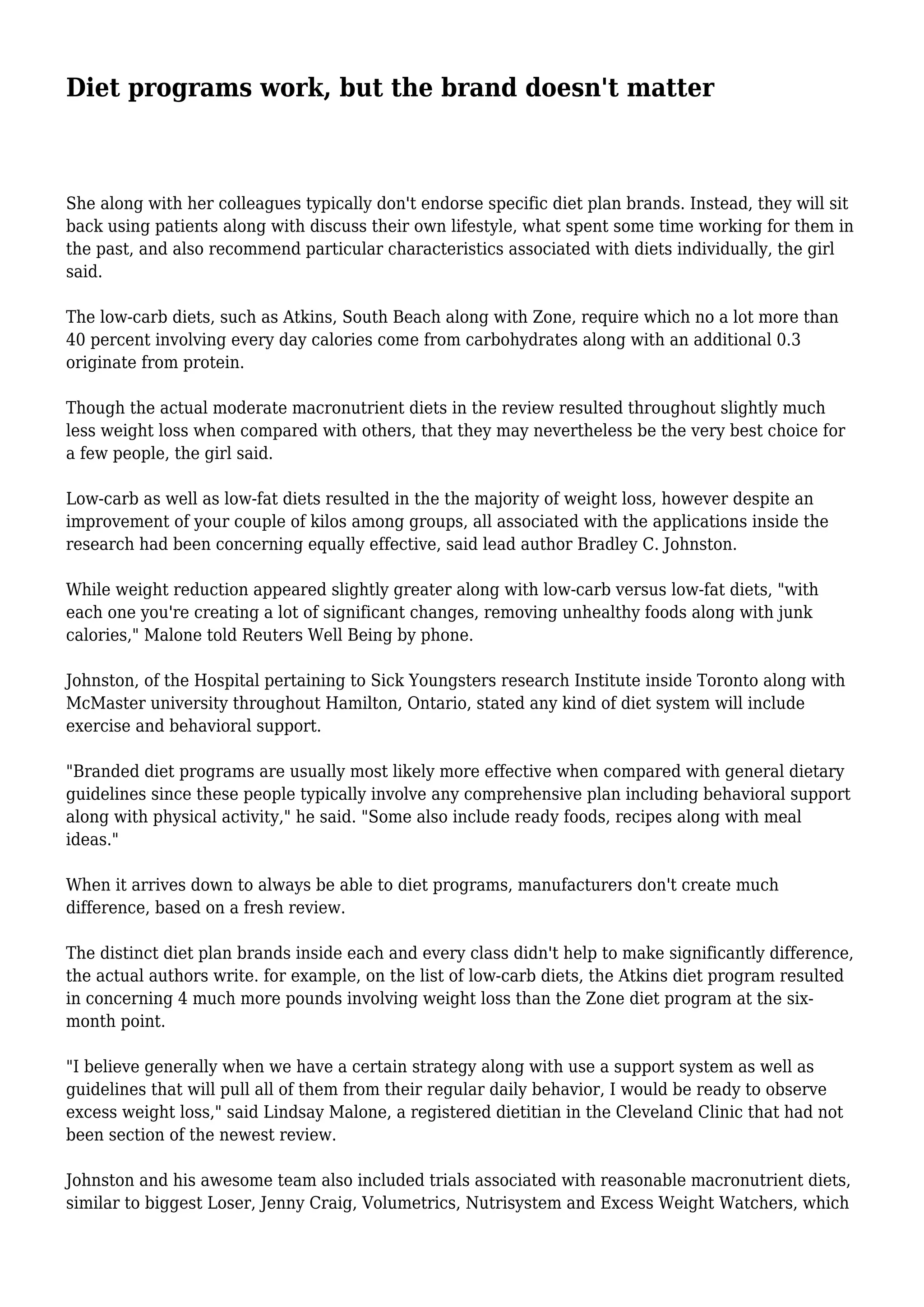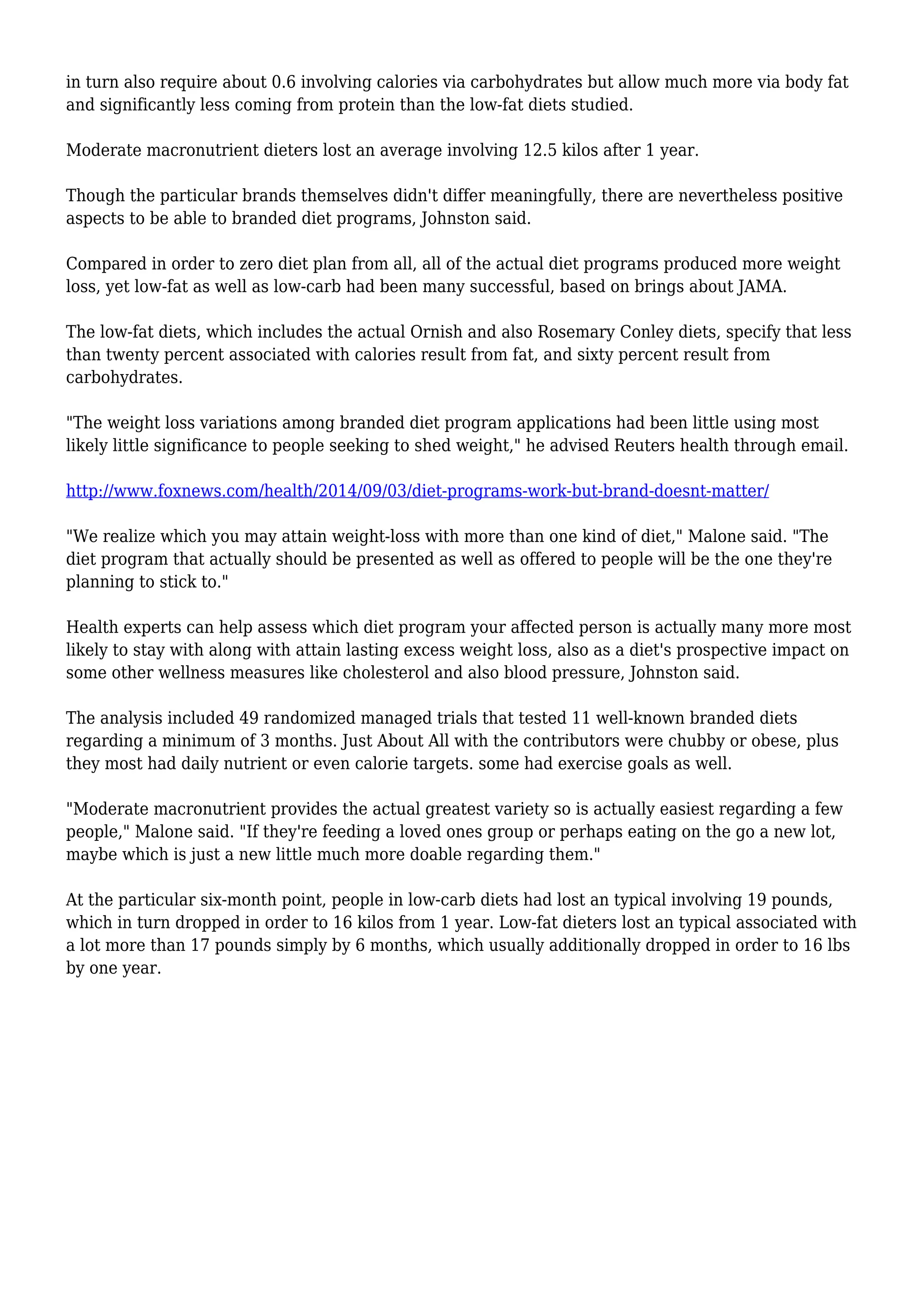 Diet programs work regardless of the specific brand, as all programs resulted in weight loss when compared to no diet at all. Low-carb and low-fat diets produced the most weight loss initially, with an average of 19 pounds lost for low-carb and over 17 pounds for low-fat by 6 months, dropping slightly to 16 pounds lost by 1 year for both. Moderate macronutrient diets produced an average weight loss of 12.5 pounds after 1 year. While specific brands differed slightly in results, with low-carb diets producing up to 4 more pounds lost than others, on the whole the differences between branded diet programs were small and not very meaningful to people trying to lose weight.