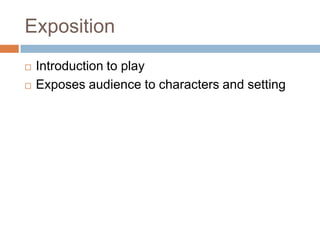 The document summarizes key elements of drama, including exposition to introduce characters and setting, external and internal conflicts that develop throughout rising action and climax, and resolution of problems by the end. It also notes that drama "shows, don't tells" through dialogue and actions on stage, requiring collaboration from playwrights, directors, actors, and designers to convey the story through performance instead of narrative description.