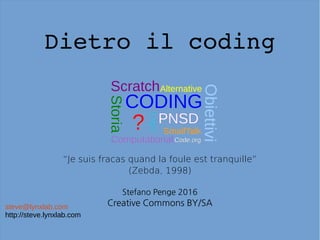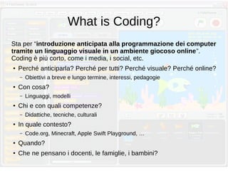 Il documento esplora il concetto di coding come introduzione alla programmazione per bambini attraverso linguaggi visivi in ambienti ludici, ponendo l'accento sui suoi benefici educativi e culturali. Analizza le critiche e le diverse opinioni riguardo all'implementazione del coding nelle scuole, sottolineando l'importanza di un approccio che integri teoria e pratica, etica e creatività. Infine, evidenzia la necessità di sviluppare curriculum che colleghino il coding ad altre materie, favorendo una visione olistica della formazione digitale.