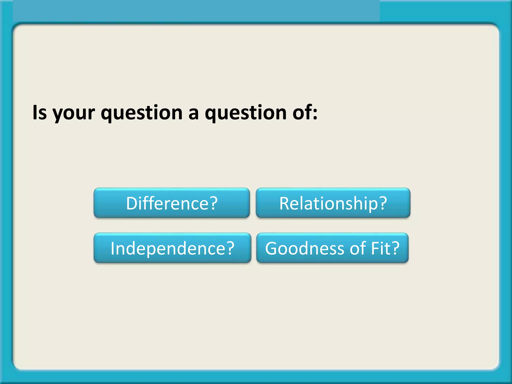Examples are given for each type of question to illustrate key concepts like comparing groups, examining associations between variables, assessing independence, and evaluating how a claim fits observed data.