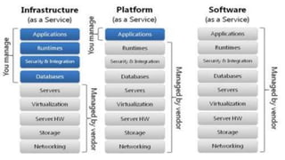 SaaS allows users to access and use software applications hosted by a third party provider and accessed through the web browser. PaaS delivers a platform for developers to build customized applications on without maintaining the underlying infrastructure. IaaS provides on-demand access to scalable compute resources like storage, servers, and networking that customers can purchase and manage as needed. FaaS allows customers to develop and run application functions without maintaining the infrastructure by triggering functions through events.