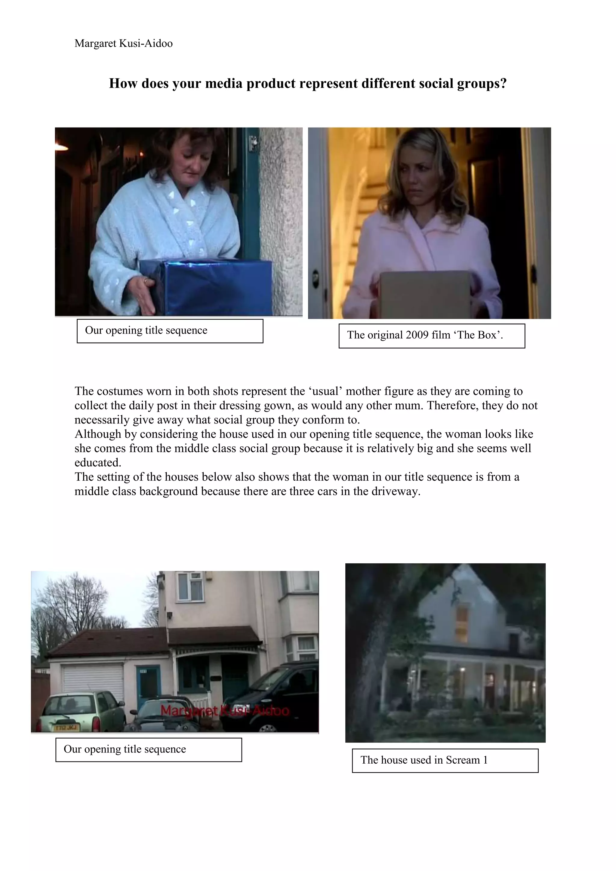 The document discusses how a media product represents different social groups. It analyzes the costumes and setting in the opening title sequence, which represent a middle class mother figure collecting the mail in her dressing gown like any other mom. The relatively large house and three cars in the driveway also indicate the woman is from a middle class background based on her education level and property.