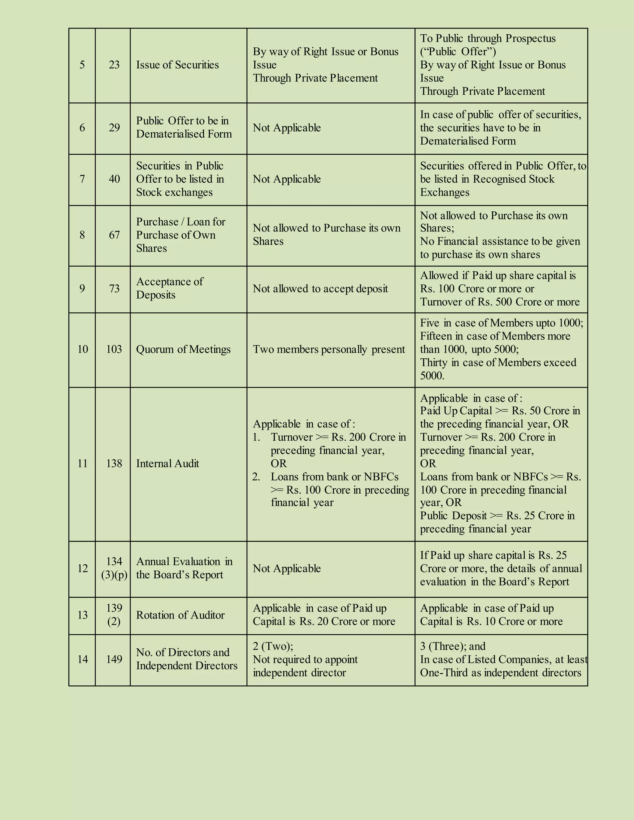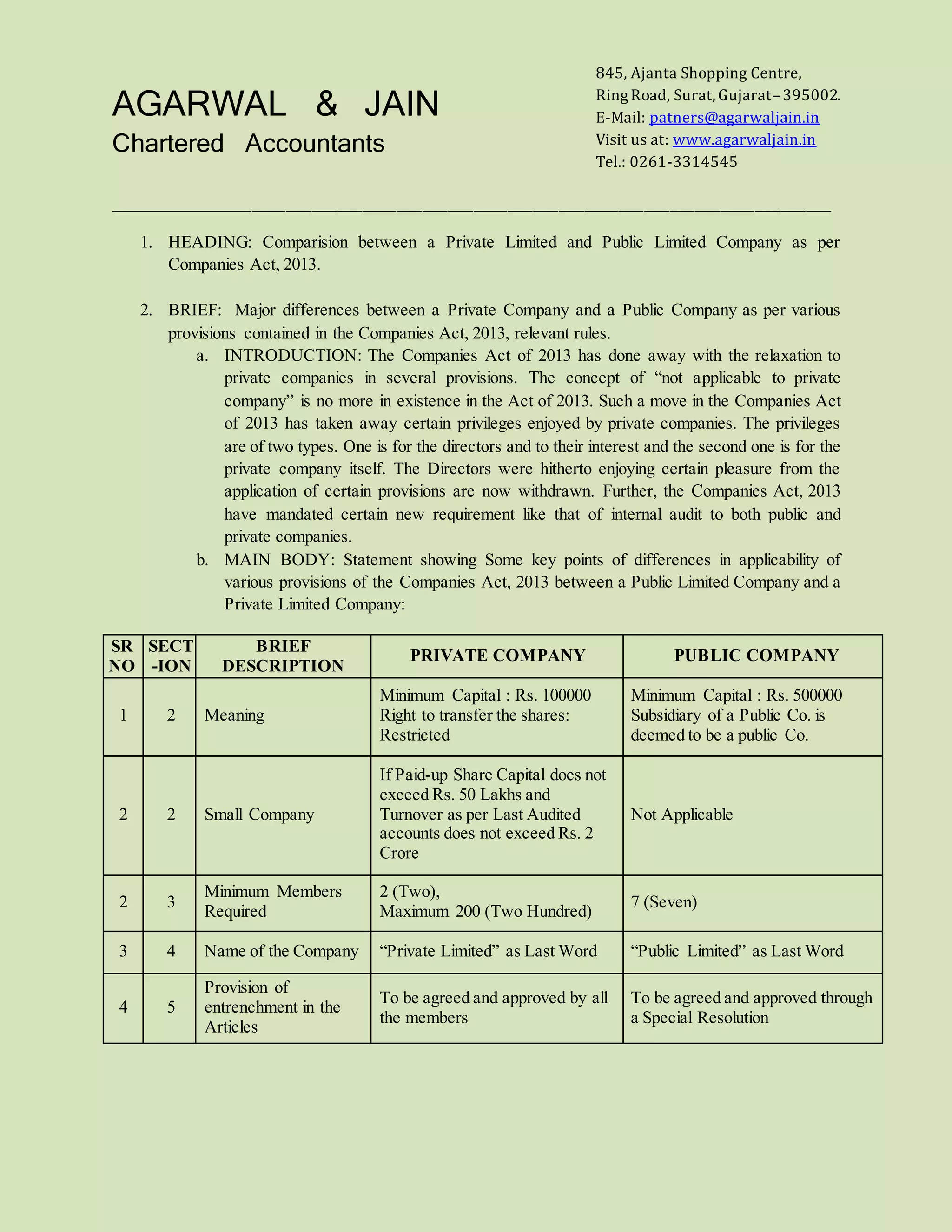 The document compares private limited and public limited companies under the Companies Act, 2013, highlighting key differences in provisions that apply to each type of entity. Notably, many privileges previously exclusive to private companies have been eliminated, and new compliance requirements have been introduced for both categories. The conclusion suggests that the changes have rendered private companies less advantageous for MSMEs, while also introducing the limited liability partnership as an alternative business structure.