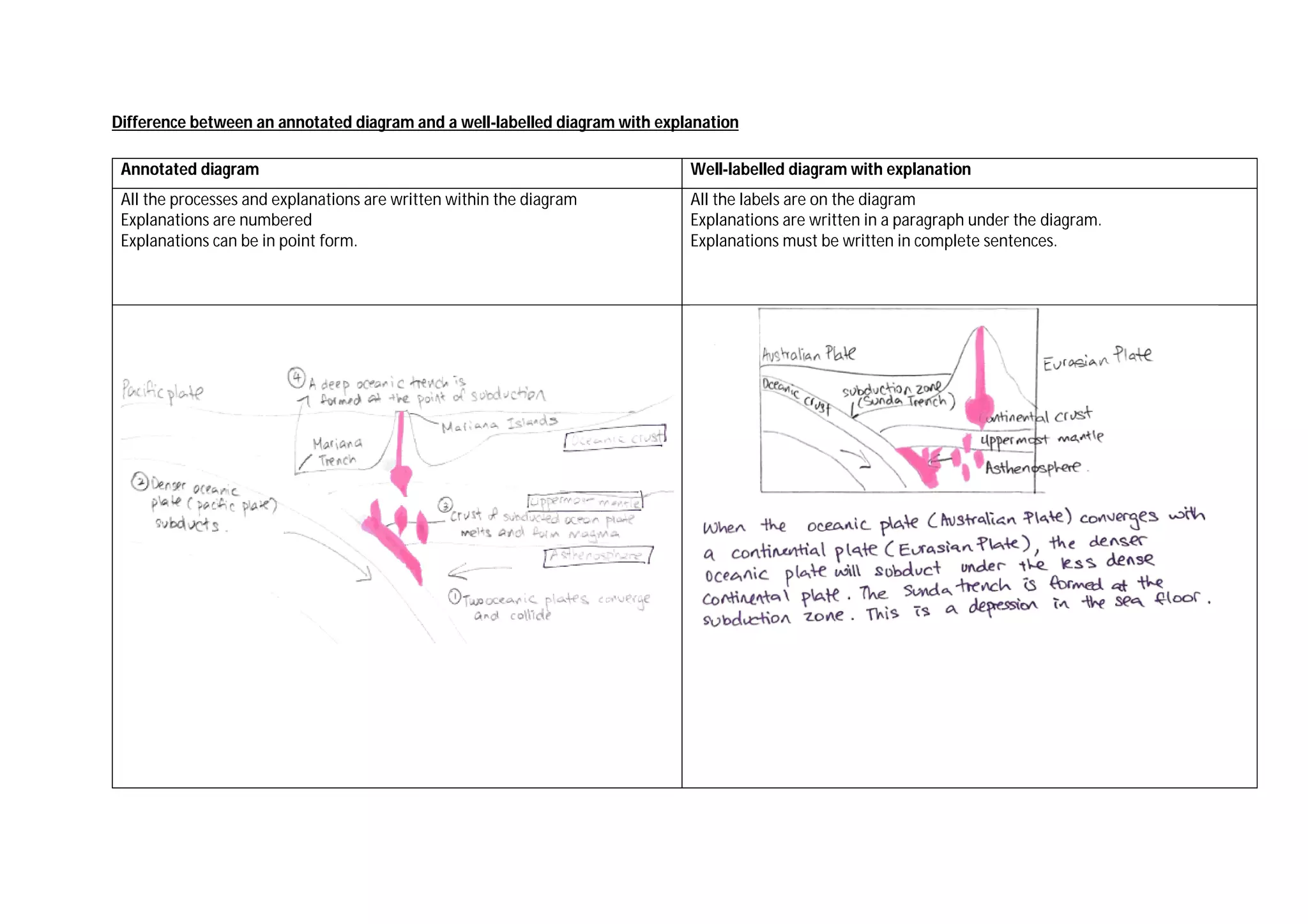 An annotated diagram includes all processes and explanations written within the diagram itself, with explanations in point form or numbered. A well-labelled diagram has all labels on the diagram but provides a paragraph of explanations under the diagram in full sentences to further describe the diagram.