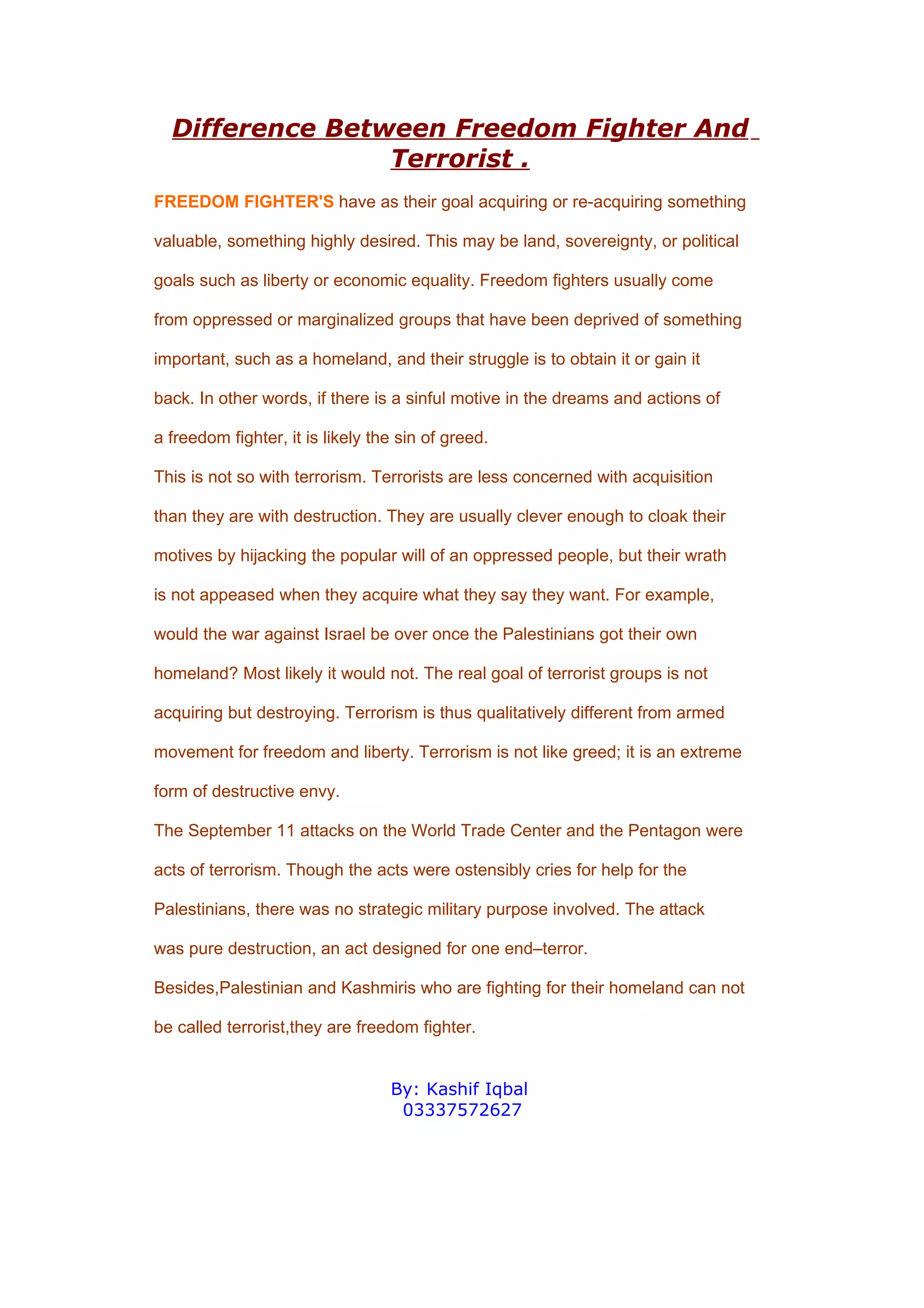 Freedom fighters are seeking to acquire or regain something valuable like land or political goals of liberty, while terrorists aim to destroy rather than acquire. Terrorism cloaks its true motives of destruction under popular causes but the goal is not appeased by acquiring demands. The September 11th attacks were acts of terrorism despite claims to help Palestinians, as there was no strategic purpose beyond creating terror. Palestinians and Kashmiris fighting for their homeland should be called freedom fighters, not terrorists.