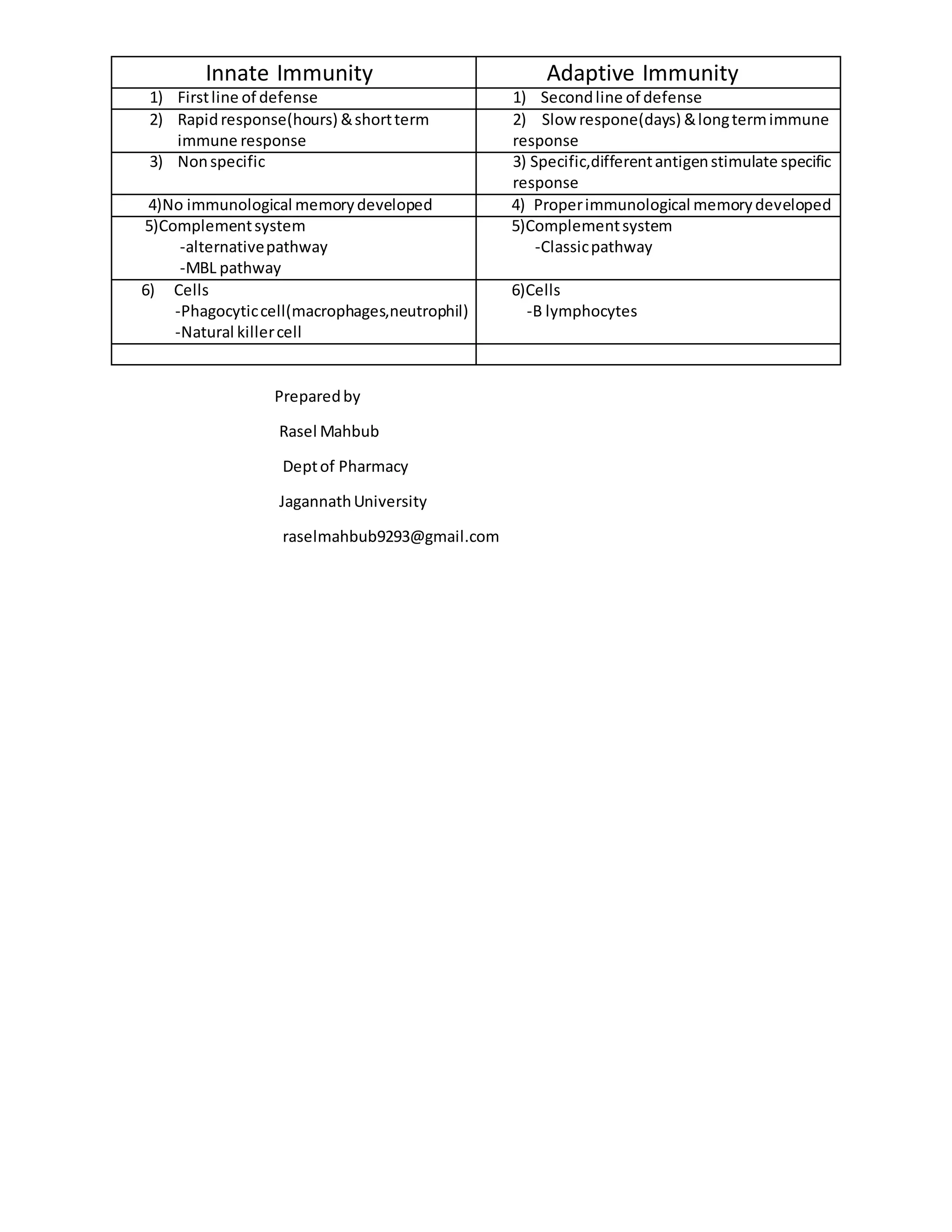 Innate immunity provides a first line of defense through nonspecific, rapid responses without immunological memory. Adaptive immunity provides a second line of defense through slower, specific responses to different antigens that generate immunological memory through B lymphocytes. Both involve the complement system and immune cells, but innate immunity uses the alternative and MBL pathways while adaptive immunity uses the classic pathway along with B lymphocytes.