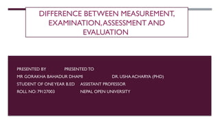 The document outlines the distinctions between measurement, examination, assessment, and evaluation in education. Measurement involves assigning numerical values to performance, examination is a formal testing method, assessment encompasses various means of documenting learning, and evaluation makes judgments based on criteria. Understanding these differences is crucial for enhancing educational practices and student outcomes.