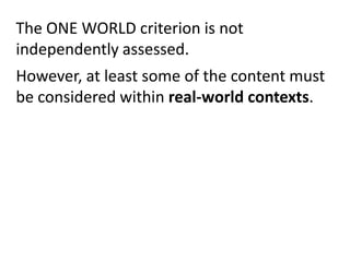 The DP Science criteria are assessed differently than in MYP Science. The ONE WORLD and COMMUNICATION criteria are still expected to be considered but are not independently assessed. The KNOWLEDGE AND UNDERSTANDING criterion becomes more heavily assessed through written exams. The SCIENTIFIC INQUIRY and PROCESSING DATA criteria are broken into separate criteria for design, data collection, conclusion and evaluation, with each aspect assessed on a scale of 0 to 2. The ATTITUDE IN SCIENCE criterion becomes two criteria for manipulative and personal skills, also assessed on a scale of 0 to 2 for each aspect.