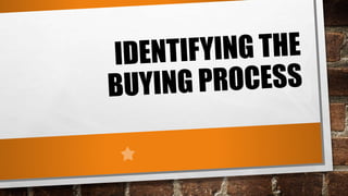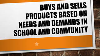 The document explains the concepts of needs, wants, and demands, highlighting that needs are essential for survival while wants are items that enhance comfort but are not necessary. It describes the buying process as a series of steps from recognizing needs and wants, searching for information, evaluating choices, making a purchase decision, and then evaluating the purchase experience. Examples illustrate the types of needs and wants in various contexts, specifically in education and community settings.