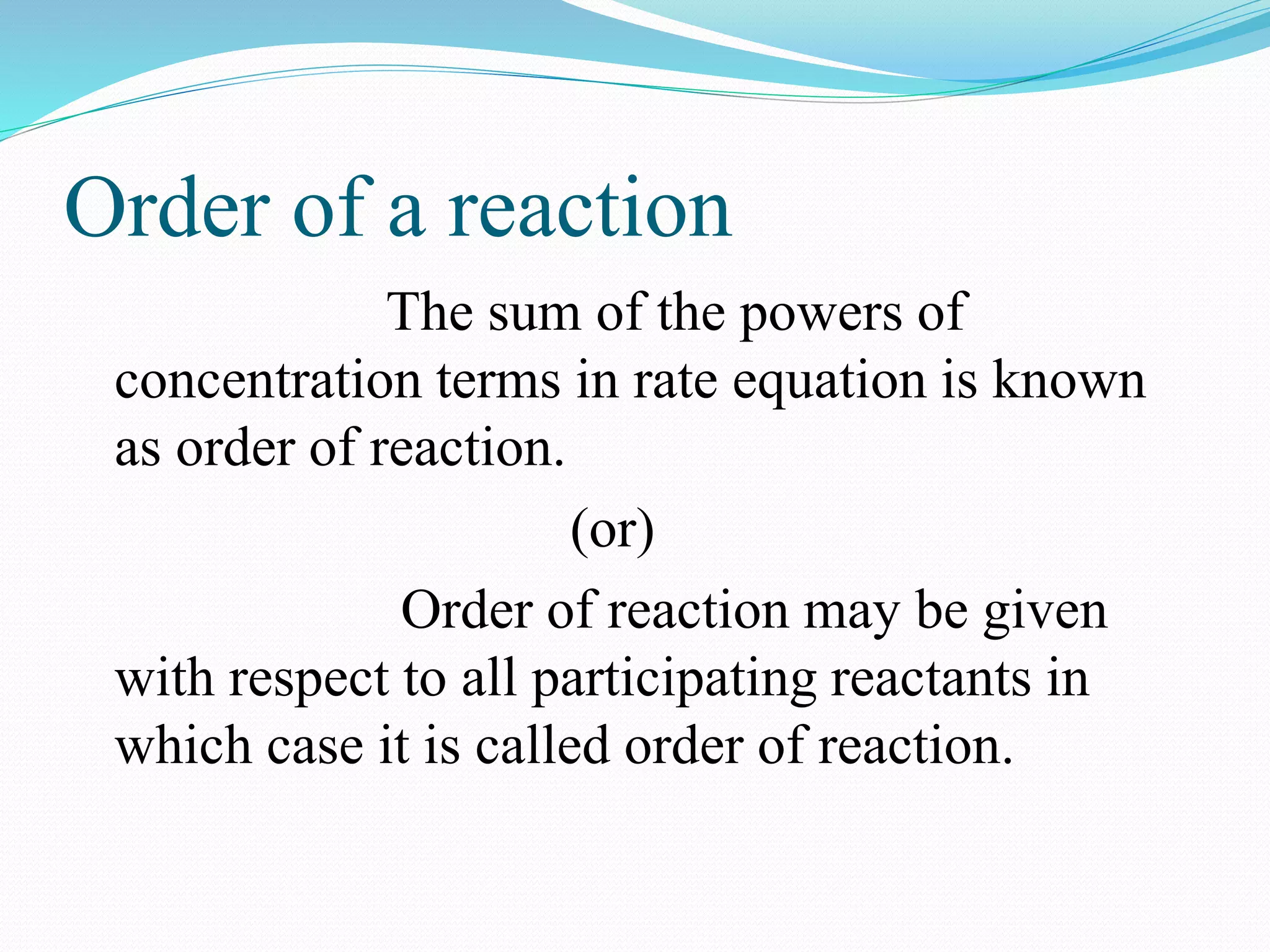 Order of areaction The sum of the powers of concentration terms in rate equation is known as order of reaction. (or) Order of reaction may be given with respect to all participating reactants in which case it is called order of reaction.