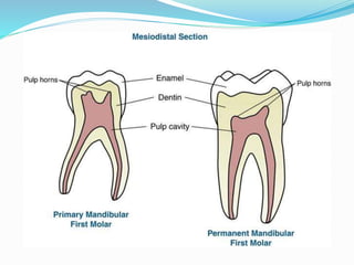 This document compares the anatomical, morphological, histological, and applied aspects of primary and permanent teeth. It outlines key differences between primary and permanent teeth, including their duration, number, enamel thickness, occlusal plane, cusps, roots, pulp chamber, dentin, and periodontal ligament structures. The morphological and histological differences between primary and permanent teeth have important applications in procedures like cavity preparation, extraction, endodontic treatment, and pulp therapy.