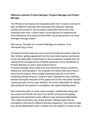 Product managers envision new products, evaluate market needs and timing, find suitable customers, drive marketing activities, and are responsible for pricing. Program managers align different teams, create execution roadmaps, mitigate risks, and ensure on-time delivery meeting quality standards. Project managers execute the vision under guidance, work at the code level, and produce the working software product on time, with quality and customer satisfaction.