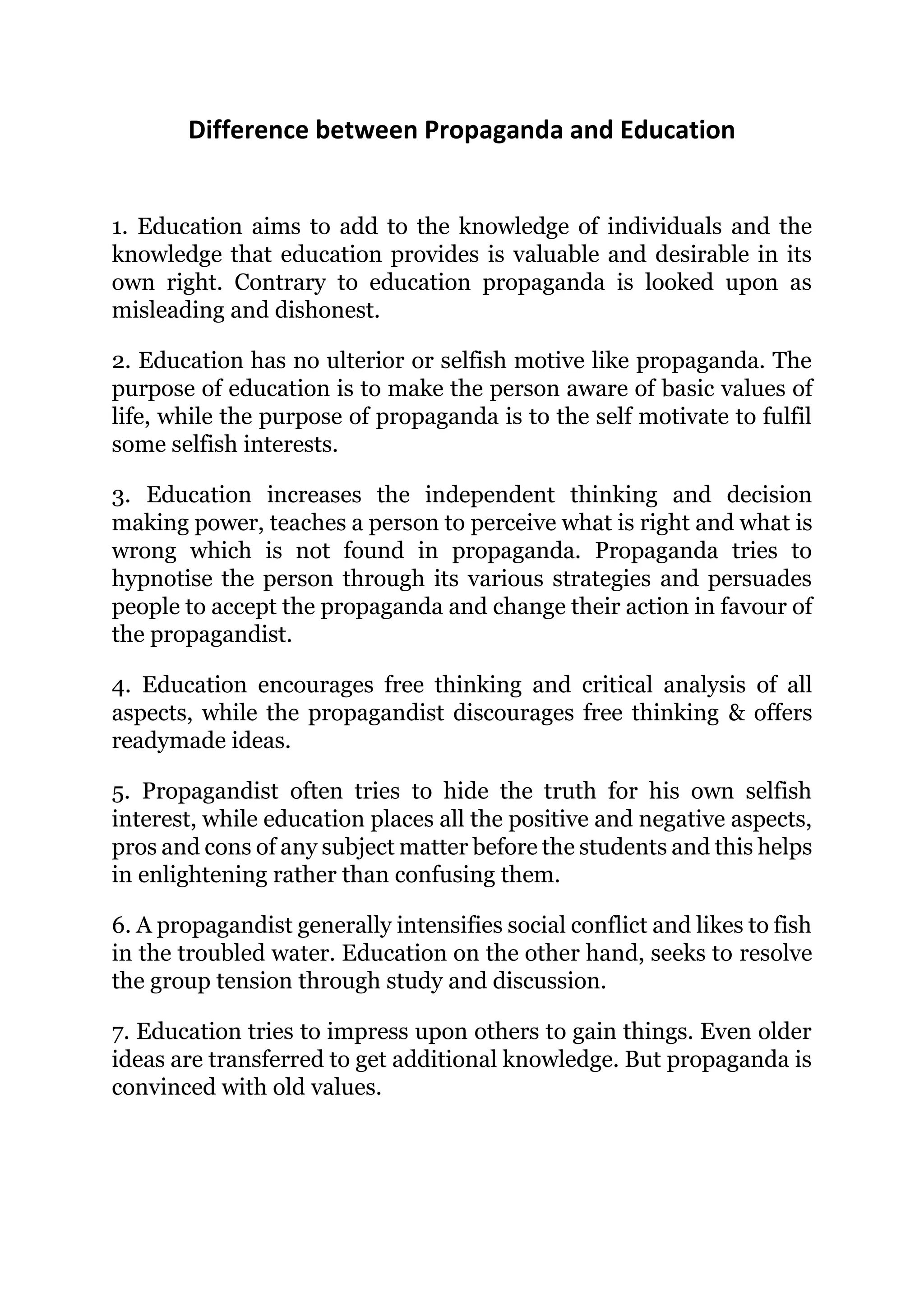 Education aims to increase knowledge and independent thinking for its own sake, while propaganda has ulterior motives of manipulating people to serve some selfish interest. Propaganda discourages free thinking and tries to hide the truth, persuading people to accept readymade ideas without critical analysis. In contrast, education presents all aspects of issues to enlighten students and encourages resolving tensions through open discussion rather than intensifying conflicts like propaganda does.