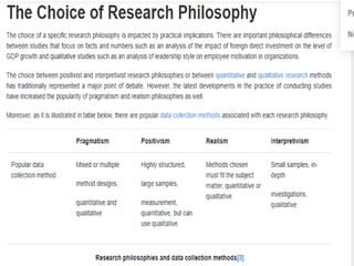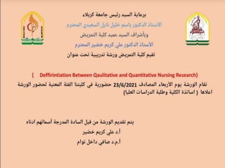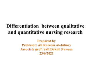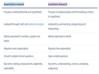 The document discusses the differences between qualitative and quantitative nursing research, highlighting their methodologies, data collection methods, and when to use each approach. Quantitative research focuses on numbers and statistical analysis to confirm theories, while qualitative research emphasizes understanding experiences through words. It also suggests a mixed methods approach for a comprehensive analysis and outlines common strategies for analyzing both types of data.