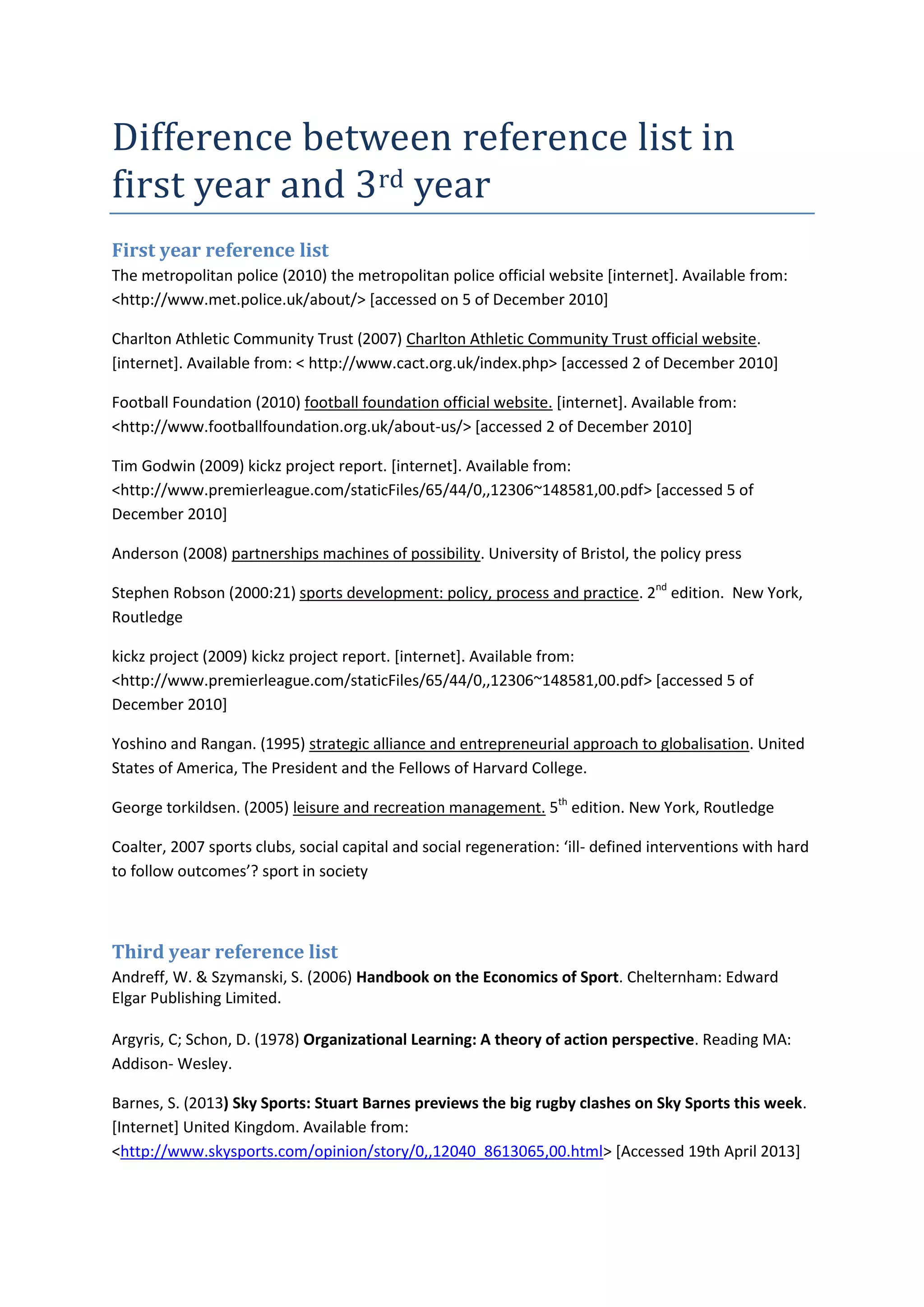 The document compares the differences between reference lists in first year and third year university assignments.