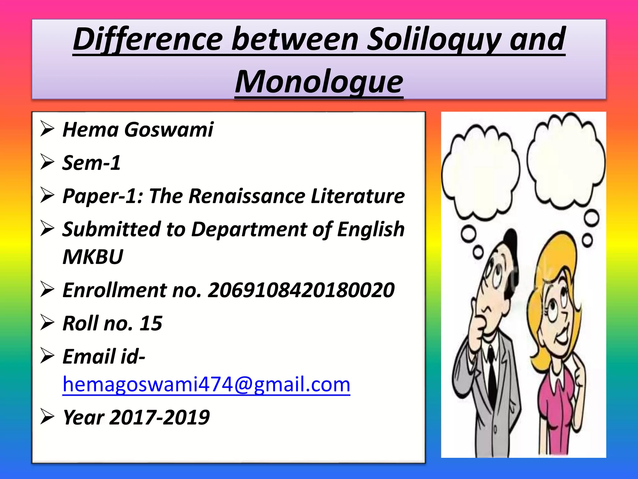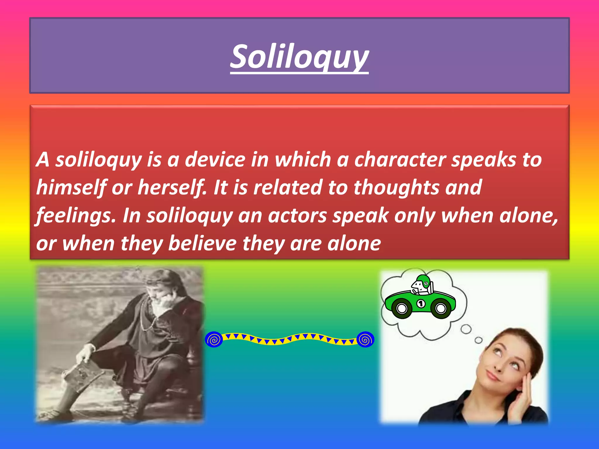 Soliloquies are when a character speaks their inner thoughts aloud when alone, while monologues are speeches addressed to other characters or an audience. In a soliloquy, the character is only addressing themselves, while a monologue has an internal or external audience. Examples provided are Hamlet's famous "To be or not to be" soliloquy and a monologue from Doctor Faustus where he pleads for more time before his soul is damned.
