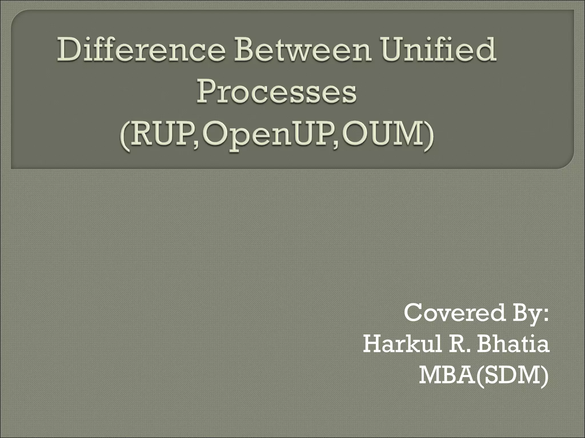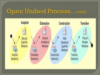 RUP is a framework developed by Rational Corporation, a division of IBM. Open UP is an open source process framework developed by the Eclipse Foundation. OUM is a framework developed by Oracle to support all Oracle products. RUP contains four phases: Inception, Elaboration, Construction, and Transition. It is an iterative process where requirements are further defined in each phase and risks are mitigated.
