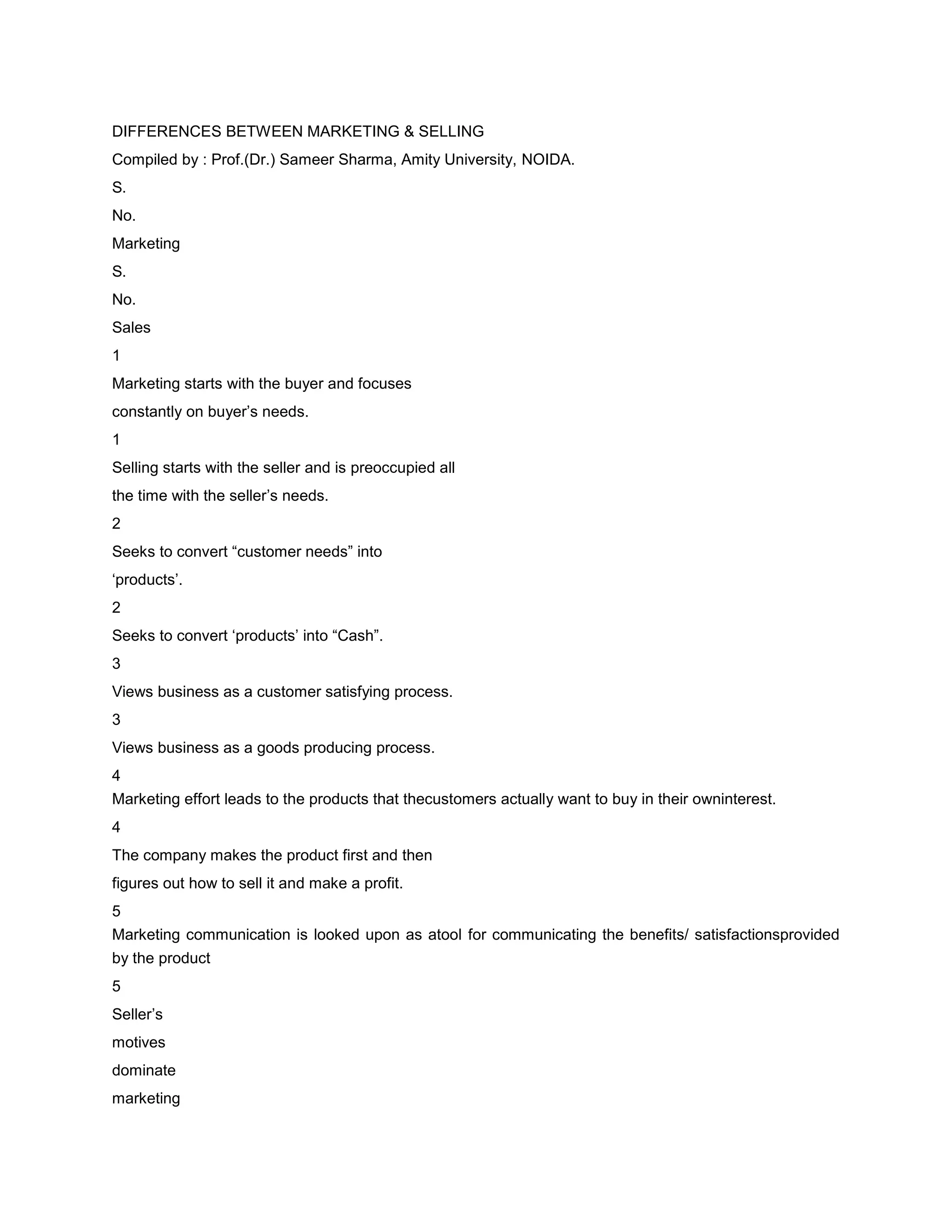 The key differences are that marketing starts with the customer while selling starts with the product, marketing aims to satisfy customers as the purpose of business while selling aims to make sales and profit, and marketing involves various pre- and post-sale activities