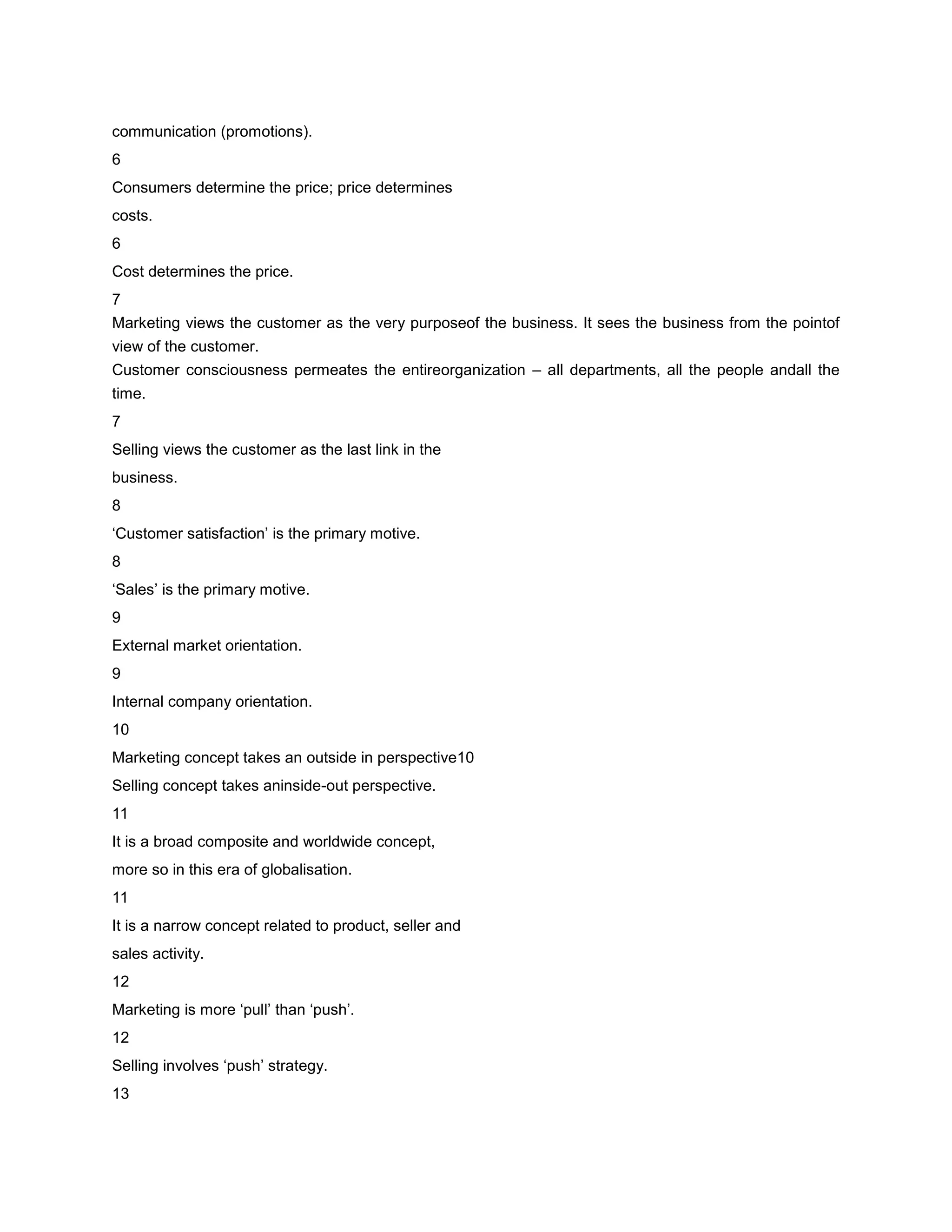 Selling focuses on moving existing products to customers and views the business as producing goods. It takes an inside-out perspective and emphasizes exchanging products for money without ensuring long-term customer value or satisfaction. Selling is a narrower concept that occurs after production.
