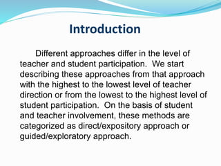 The document discusses different teaching approaches and methods. It begins by distinguishing between direct/expository approaches that have high teacher direction and guided/exploratory approaches with high student participation. It then defines key concepts like approach and method. The main types covered are direct/expository methods like deductive and demonstrative, as well as guided/exploratory methods like inductive. Characteristics, examples and advantages/disadvantages of each method are provided. The document aims to help teachers understand different instructional strategies and how to apply them based on learning objectives and content.