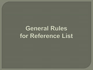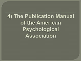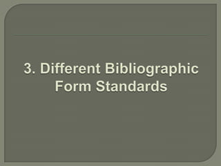 This document provides guidelines for bibliographic form and style according to different bibliographic style manuals such as Chicago, MLA, APA, AMA and others. It discusses the components of a reference, such as author, date, title and publication details. It also provides examples of references formatted according to different styles for various document types such as books, articles, websites and more. Ordering of references and special cases are also covered.