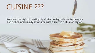 The document discusses various cuisines, focusing on Italian, French, and Japanese cooking styles, including their distinctive ingredients and techniques. It highlights notable dishes and their ingredients, such as spaghetti alle vongole and coq au vin, as well as facts like Italy's prominent wine production and Japan's high fish consumption. Additionally, it mentions unique items like Kopi Luwak coffee, known for its unusual production method and high price.
