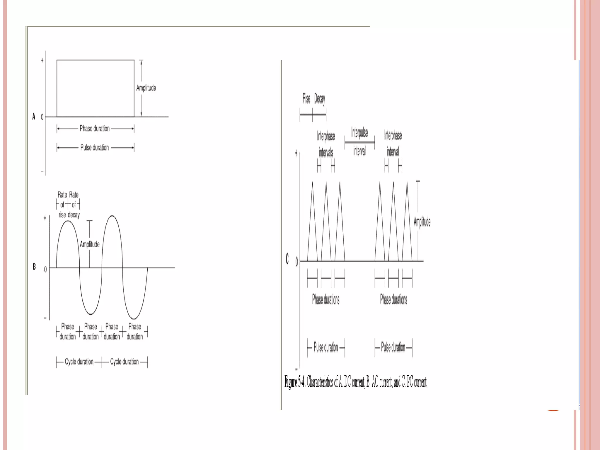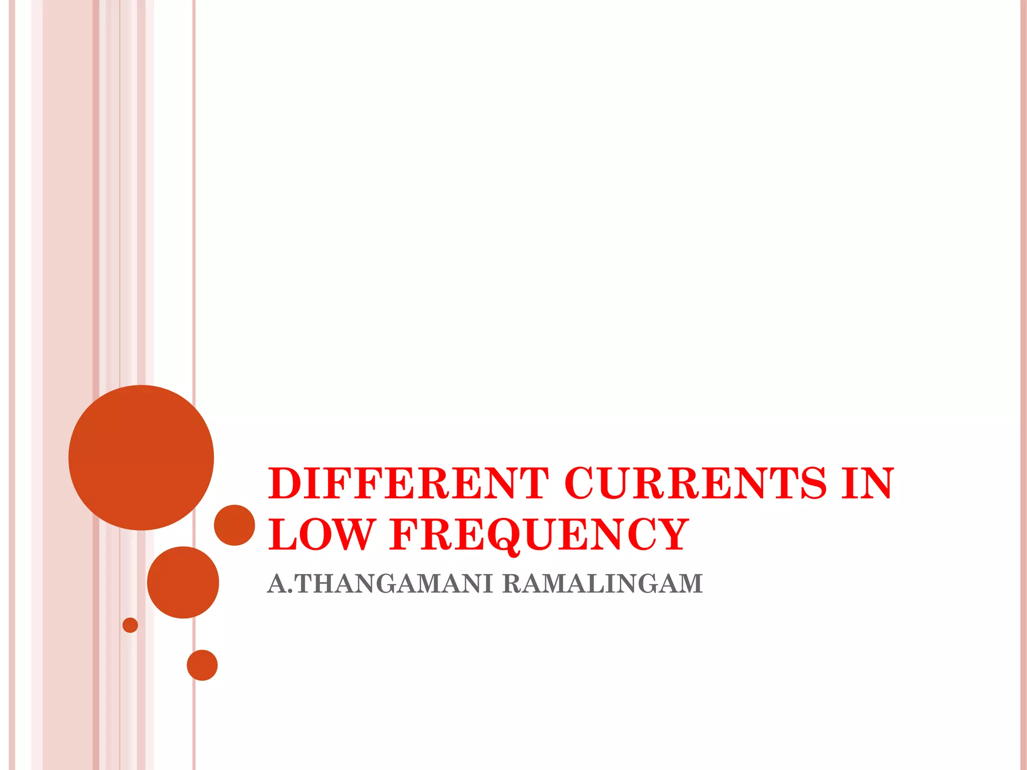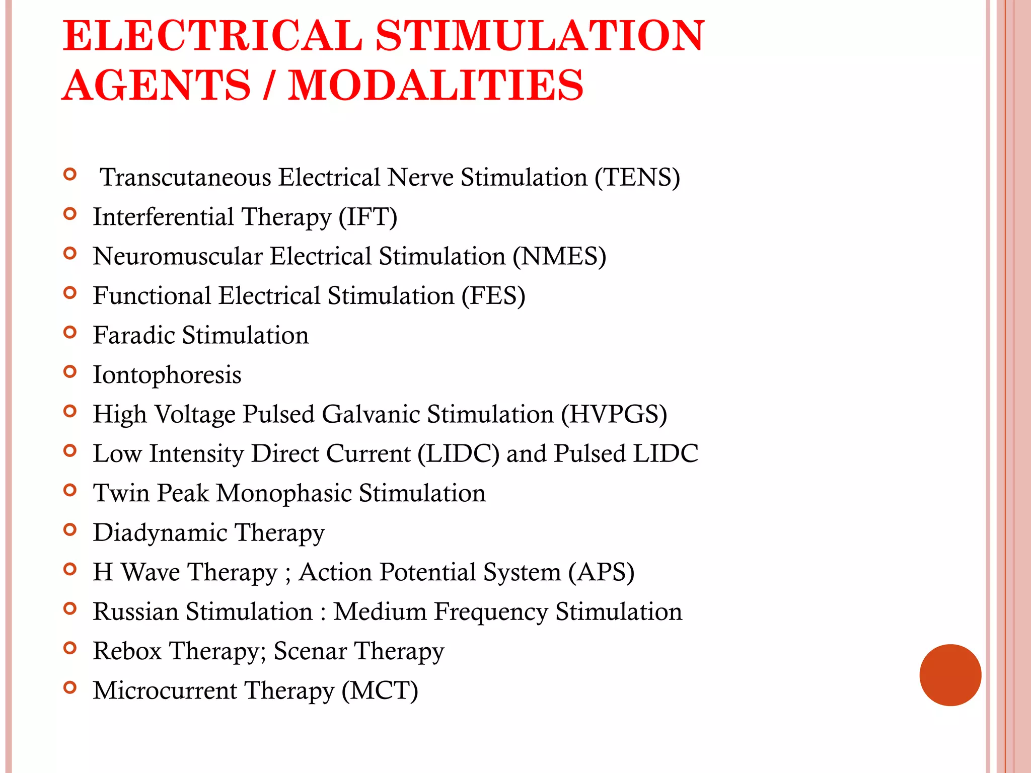 This document discusses different modalities used in low frequency electrical stimulation. It outlines various agents used including TENS, IFT, NMES, FES, faradic stimulation, iontophoresis, HVPGS, LIDC, twin peak monophasic stimulation, diadynamic therapy, H wave therapy, APS, Russian stimulation, Rebox therapy, and microcurrent therapy. It provides details on wave forms, currents, and specifications of different devices. Microcurrent therapy is described as using currents that are 1/1000th of an ampere smaller than TENS to alleviate pain, inflammation, spasm and promote healing for various injuries and conditions.