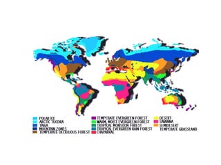 This document lists and describes different ecosystems including northern coniferous forests, continental shelves, agricultural land, temperate grasslands, woodlands and shrublands, estuaries, swamps and marshes, desert scrud, lakes and streams, tundra in both the arctic and alpine regions, and extreme deserts.