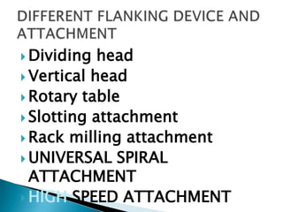 This document discusses different types of milling machine attachments and factors to consider when selecting milling cutters for jobs. It describes dividing heads, vertical heads, rotary tables, slotting attachments, rack milling attachments, universal spiral attachments, and high speed attachments. When choosing milling cutters, considerations include the material being cut, desired cutting speed, type of cut, and ensuring the cutter is appropriately sized for the job.