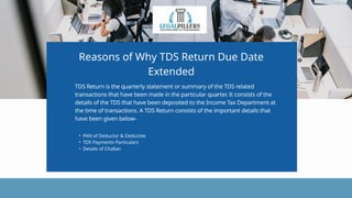 The document outlines reasons for the extension of TDS return due dates, highlighting administrative overloads, the implementation of new tax regulations, technical glitches, public appeals, festive seasons, and policy changes as key factors. It emphasizes the importance of understanding these due dates for tax compliance and suggests consulting professionals for guidance. Overall, it provides insights into the circumstances under which the government may extend TDS return deadlines.