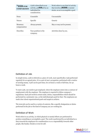 The document explores the differences between 'job' and 'work', clarifying that 'job' refers to a specific position or task performed for monetary compensation, while 'work' encompasses a broader range of activities involving physical or mental effort to achieve goals. Key distinctions include that 'job' is a countable noun associated with formal employment, whereas 'work' is an uncountable noun that may not always involve payment. The conclusion emphasizes that while jobs are specific and paid, work embodies all efforts made by an individual.