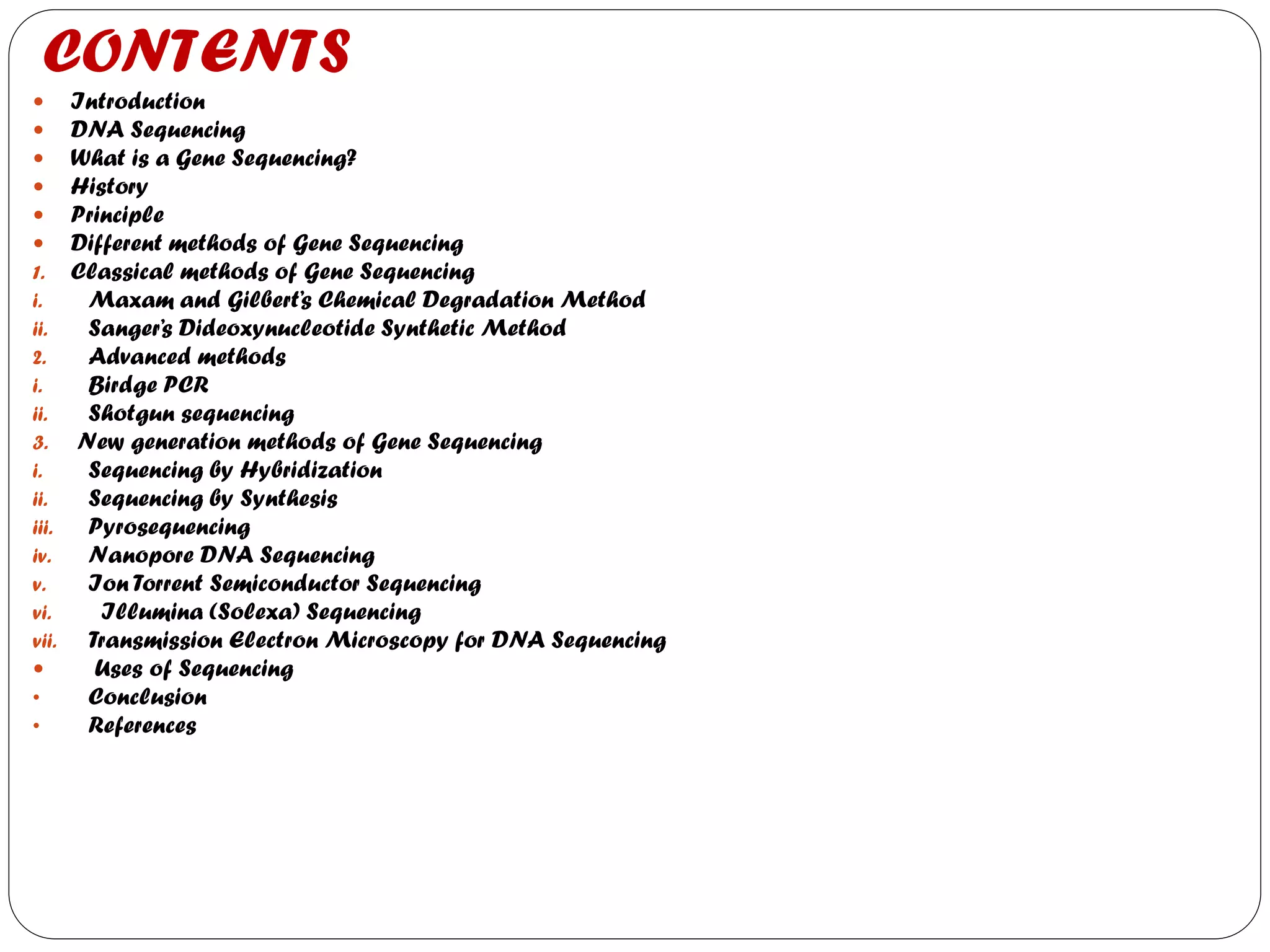 The document discusses various methods of gene sequencing. It begins with classical methods like Maxam-Gilbert chemical degradation and Sanger dideoxy chain termination. It then covers advanced methods such as shotgun sequencing and bridge PCR. The document also describes several new generation sequencing techniques, including sequencing by synthesis, pyrosequencing, nanopore sequencing, ion torrent sequencing, and Illumina sequencing. It provides details on the principles and procedures of many of these sequencing methods.