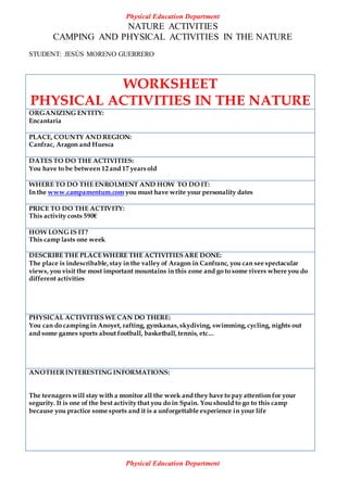 This document describes a nature camping and physical activities camp for students aged 12-17 in Almería, Andalucía, Spain. The two-week camp, organized by the Asociation of inturjoven, costs €310 and involves activities like kayaking, rowing, paddle surfing, windsurfing, climbing and beach sports in the beautiful Mediterranean landscape. It is recommended as an unforgettable experience to meet new people from other cities and countries.