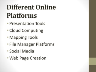 This document discusses different online platforms in information and communication technology (ICT). It describes presentation tools like Google Slides and PowerPoint Online that allow users to create slideshows. It also covers cloud computing services like Google Drive and Dropbox, mapping tools such as Google Maps and Wikimapia, file manager platforms, social media platforms including Facebook and YouTube, and tools for creating web pages in HTML.