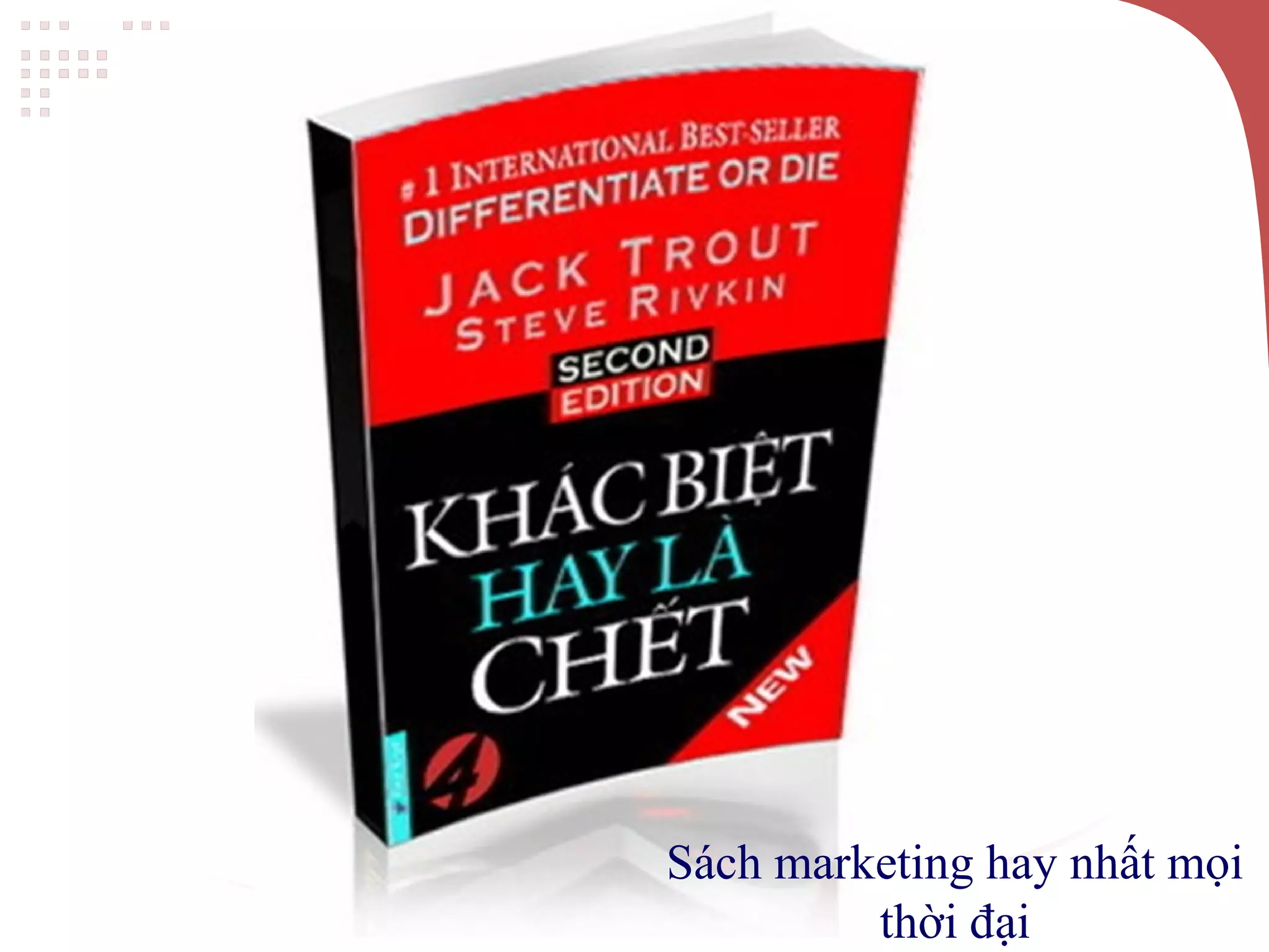 Tài liệu giới thiệu về cuốn sách 'Marketing hay nhất mọi thời đại' của Jack Trout và Steve Rivkin, tập trung vào khái niệm khác biệt hóa trong kinh doanh. Nó nhấn mạnh sự cần thiết phải duy trì sự khác biệt và phân định giữa điều muốn làm và điều cần làm để tránh thất bại trong kinh doanh. Ví dụ như trò chơi Flappy Bird cho thấy sự thông minh trong việc lựa chọn hi sinh để giữ lại tính khác biệt.