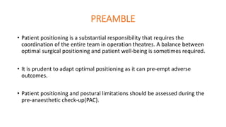 The document discusses the importance of patient positioning in anaesthesia, detailing various surgical positions, their physiological impacts, and potential complications. It emphasizes the need for careful assessment of factors such as surgery duration, patient anatomy, and risk factors to ensure optimal positioning. Additionally, it highlights the associated risks of nerve injury and complications related to each position, underlining the responsibility of the entire surgical team in maintaining patient safety and comfort.