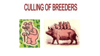 The document discusses different pig raising operations and systems of breeding pigs. It describes 5 types of pig raising operations: 1) sow-weaner/sow-litter operations which raise sows and boars to produce piglets for sale, 2) farrow to finish operations which maintain sows and boars and raise the piglets to market weight, 3) finisher operations which buy piglets and raise them to market weight, 4) boar operations which raise boars to sell semen or for natural mating, and 5) swine breeder operations which improve herd traits through selective breeding. It also outlines 4 systems of breeding pigs: purebreeding within the same breed, crossbreeding between breeds, inbreeding