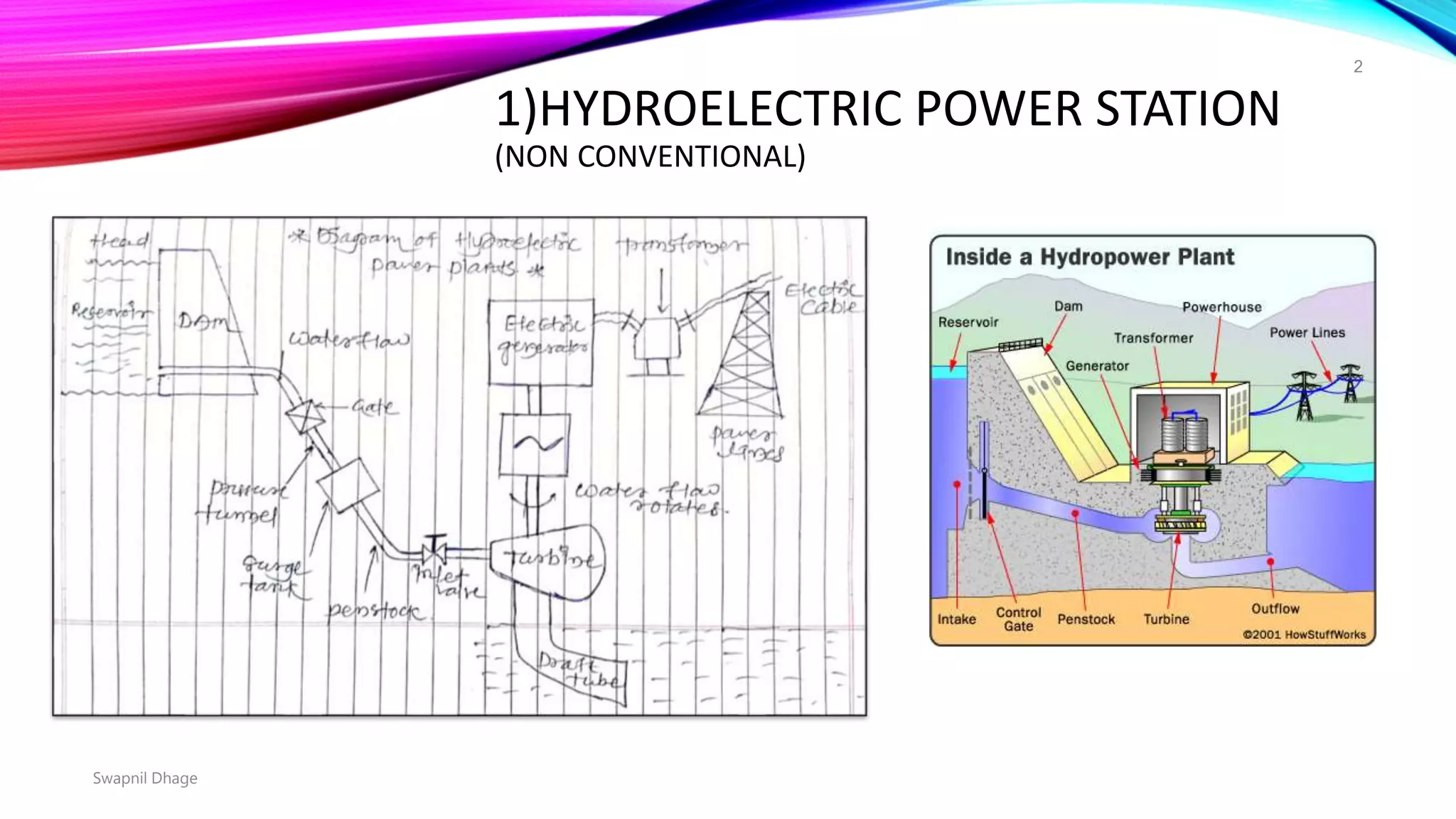 1) Hydroelectric plants use falling water to rotate turbines and generate electricity. Key components include dams, penstocks, turbines, generators, and transformers.