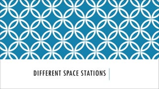 The document summarizes different space stations throughout history. It describes the first space station, Salyut 1, which was launched by the Soviet Union in 1971 to test space station systems and conduct research. It then discusses Skylab, the first American space station launched in 1973, where astronauts broke records with multi-week stays and conducted scientific experiments. Finally, it provides details on the International Space Station, the largest structure in space jointly operated by numerous countries since 1998, which circles the Earth every 90 minutes.