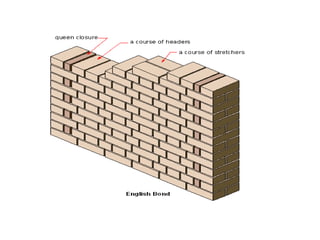 The document discusses various masonry bonding techniques, including English bond, Flemish bond (double and single), header bond, stretcher bond, and rat trap bond, highlighting their applications, advantages, and disadvantages. It describes how these bonds affect wall aesthetics and strength, and provides details on bonding patterns and brick orientations. Rat trap bond is noted for its economy and thermal efficiency, while Flemish bond is favored for its visual appeal.