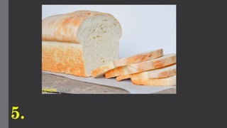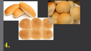 The document outlines various types of bread, including yeast breads like loaf, white, whole wheat, and rye bread, as well as buns, rolls, flatbreads, and quick breads. It describes the characteristics and uses of each type, such as sandwich suitability and flavors. Additionally, it includes a brief activity to identify different types of bread from photographs.