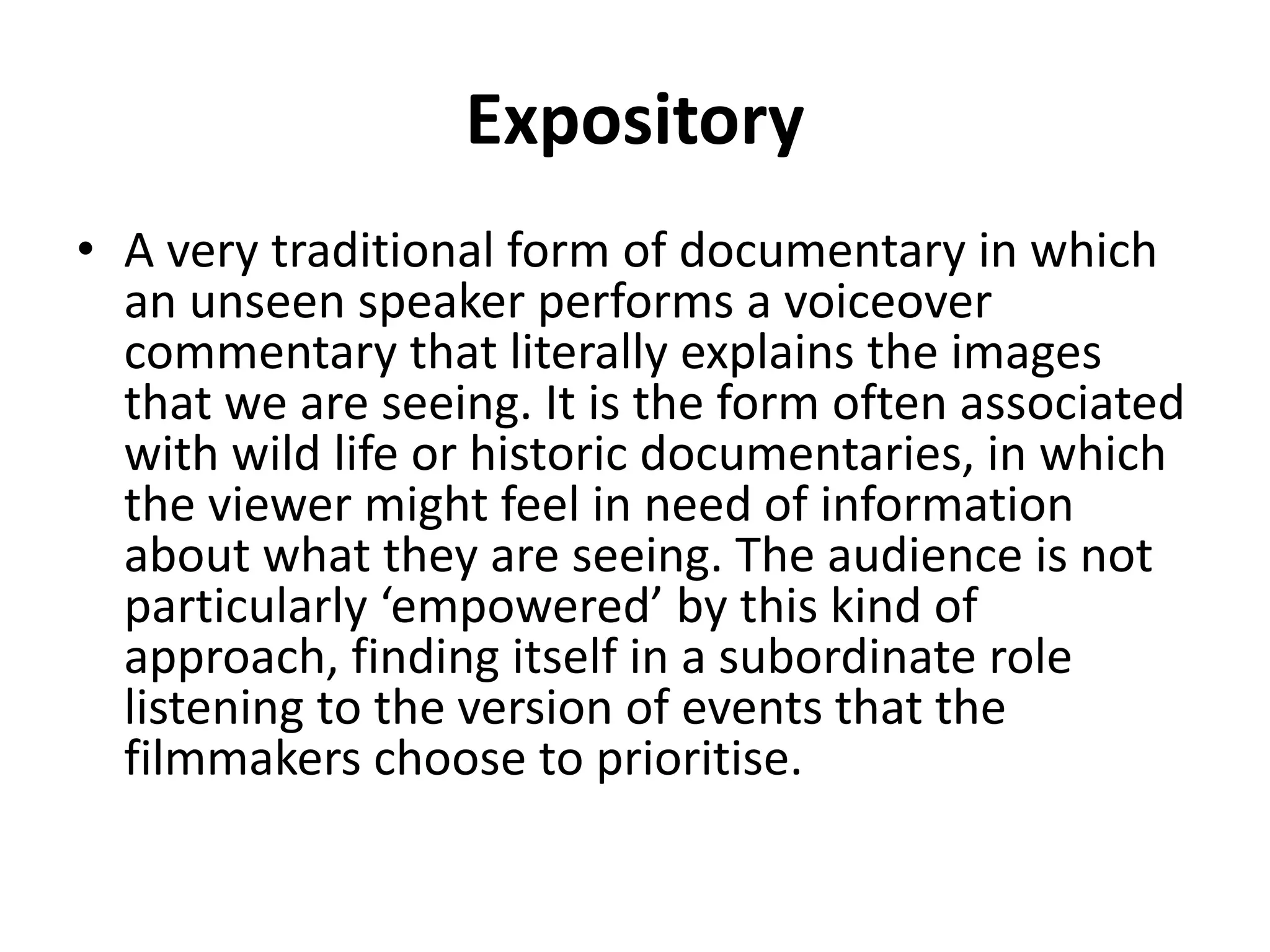 The document discusses four types of documentaries: expository, observational, interactive, and reflective. Expository documentaries feature a voiceover narration that explains the images to the viewer. Observational documentaries give the impression of being filmed without those being filmed knowing, in order to not interfere. Interactive documentaries involve interviewing subjects and may include or edit out the filmmaker's questions. Reflective documentaries are more experimental and focus on the filmmaking process and construction of reality.
